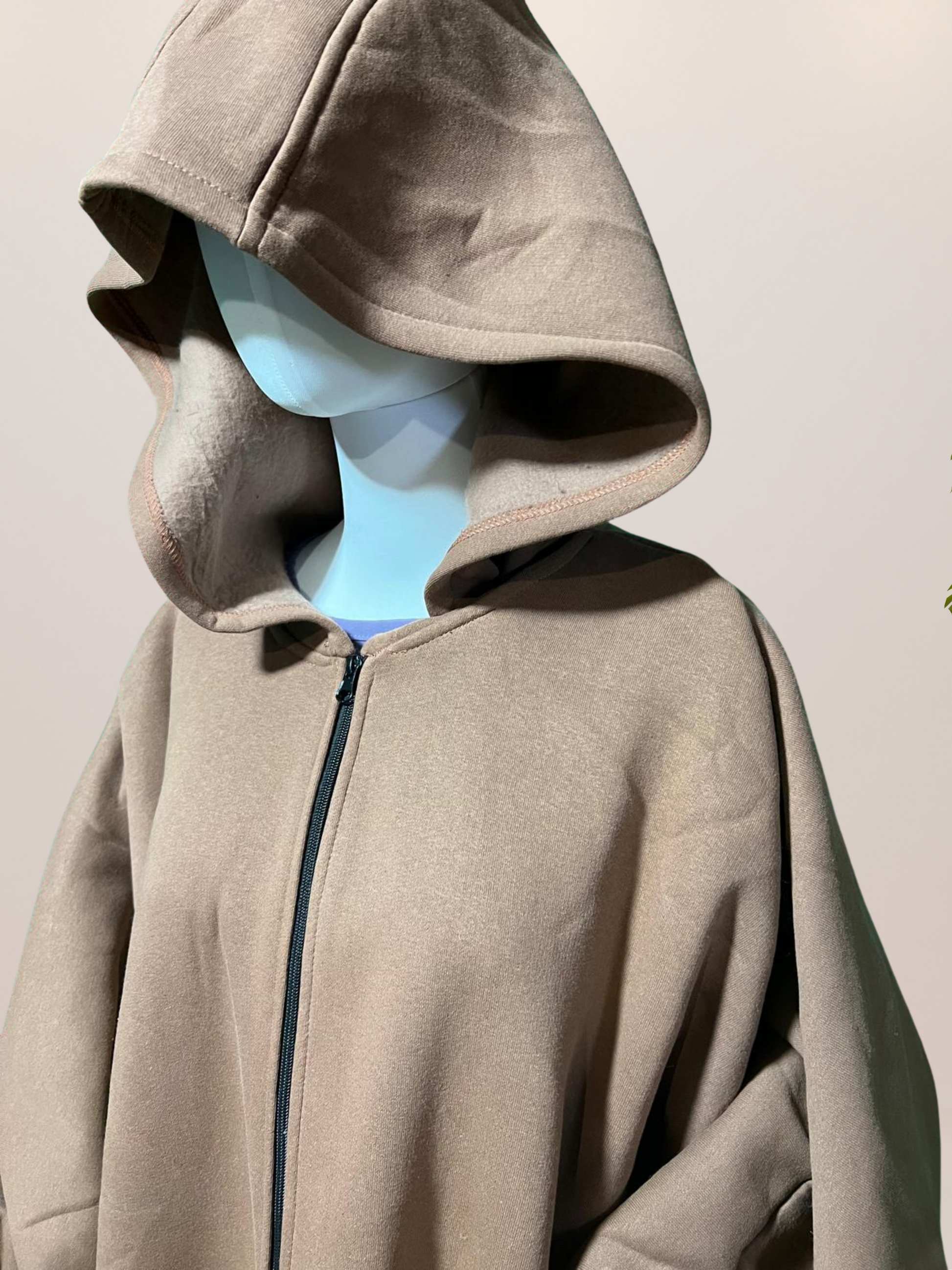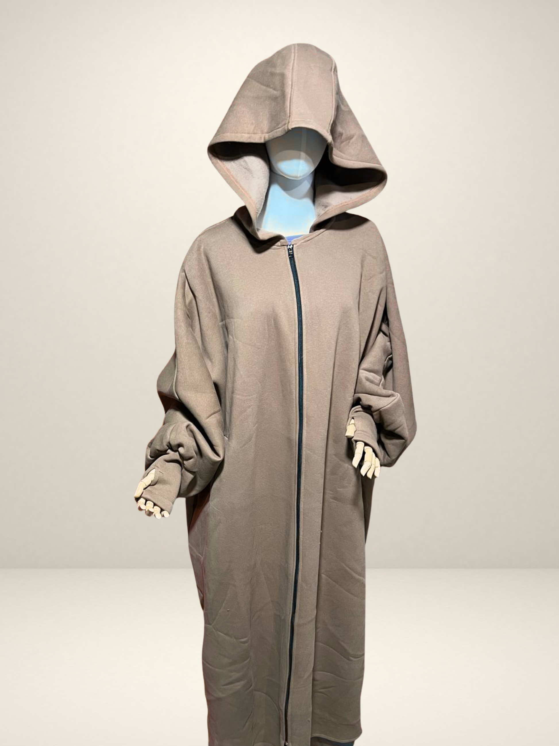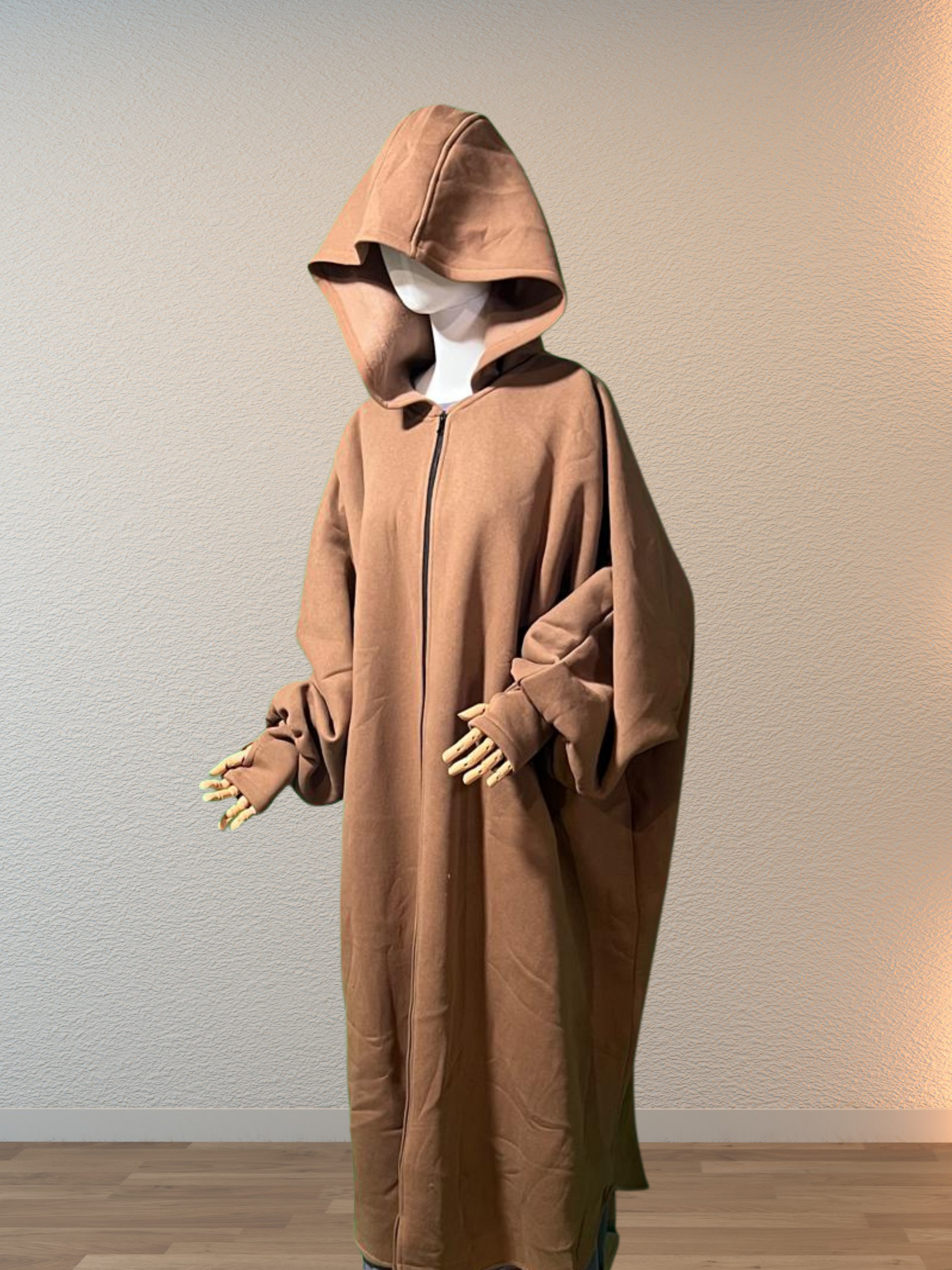 Features include a comfortable hood, front zipper, and cuffed sleeves with thumb holes for extra warmth and a secure fit. The relaxed design makes it perfect for layering in colder seasons, whether indoors or out.
